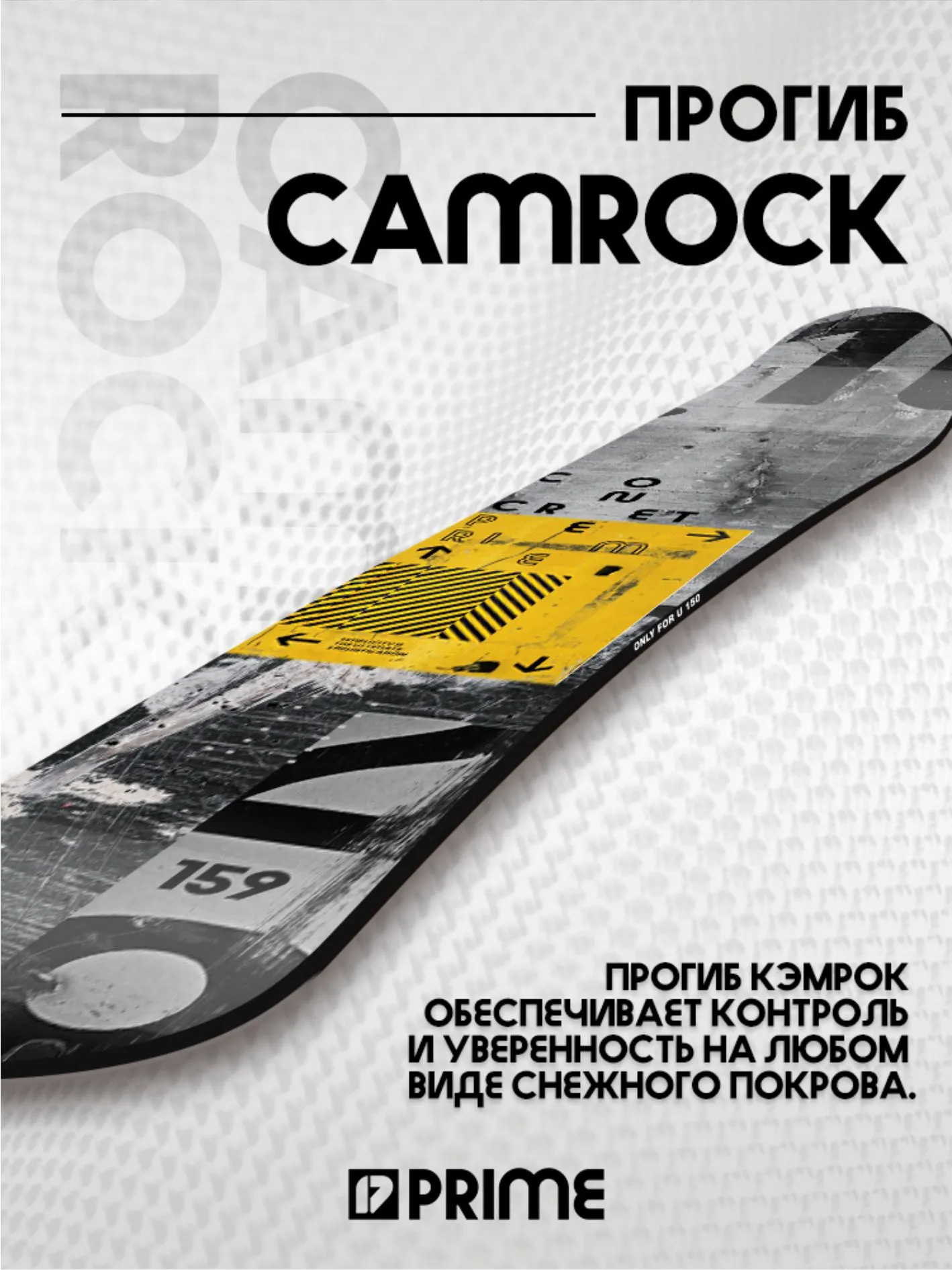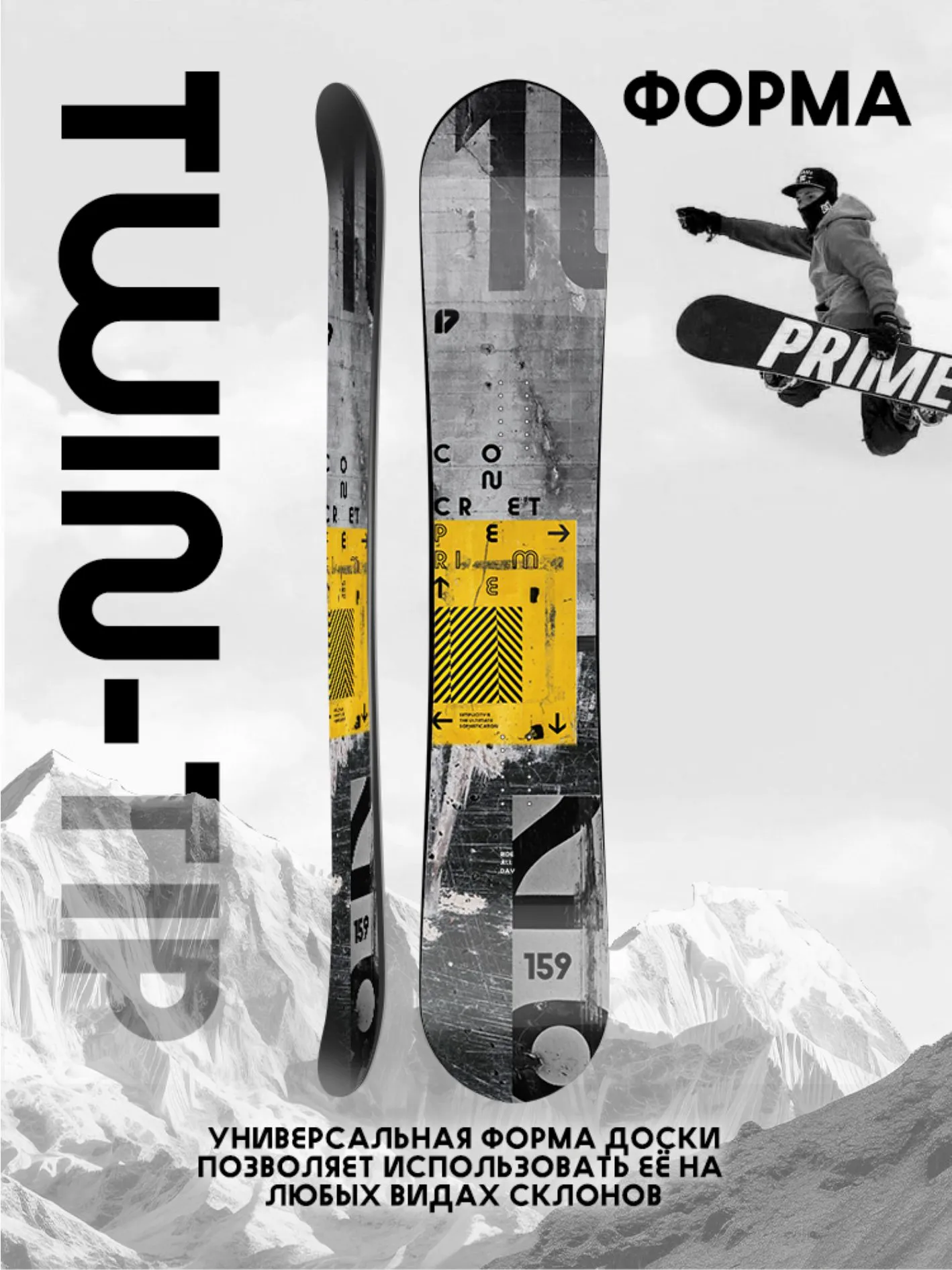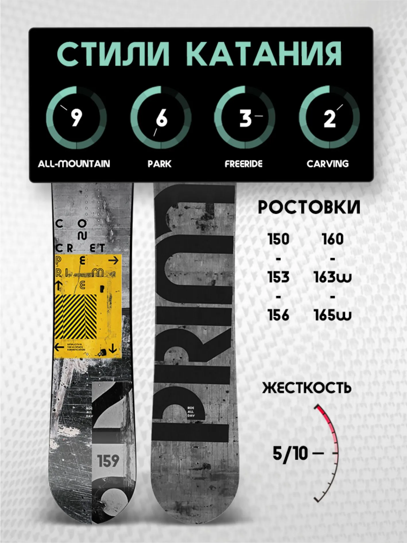 Concrete поможет прокатиться с ветерком по трассам горнолыжного курорта, а также «раздать стилька» в каком-нибудь парке. Наши инженеры снабдили сноуборд Concrete сердечником из облегченного тополя, укрепив его триаксиальной стеклотканью, и экструдированным скользяком P-Tex 4400 Ну а завершает творение работников Prime лаконичный черно-белый дизайн, который обязательно