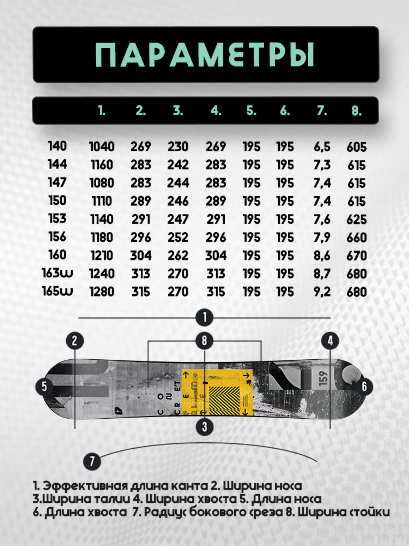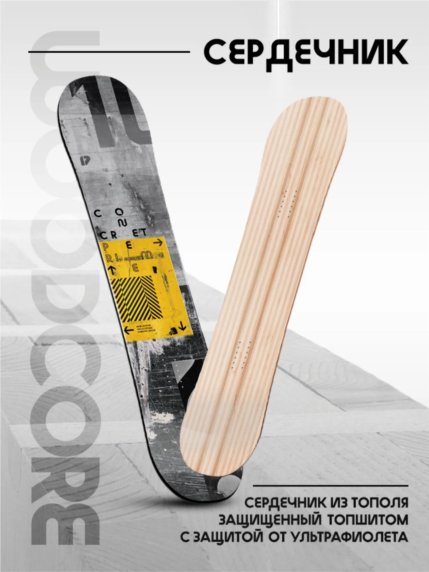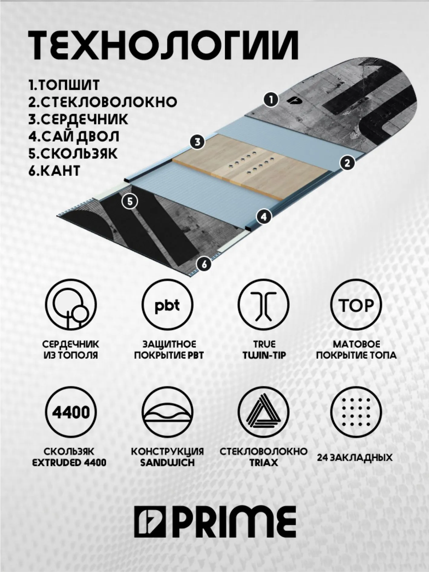 Concrete поможет прокатиться с ветерком по трассам горнолыжного курорта, а также «раздать стилька» в каком-нибудь парке. Наши инженеры снабдили сноуборд Concrete сердечником из облегченного тополя, укрепив его триаксиальной стеклотканью, и экструдированным скользяком P-Tex 4400 Ну а завершает творение работников Prime лаконичный черно-белый дизайн, который обязательно